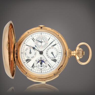 A pink gold hunting cased perpetual calendar minute repeating